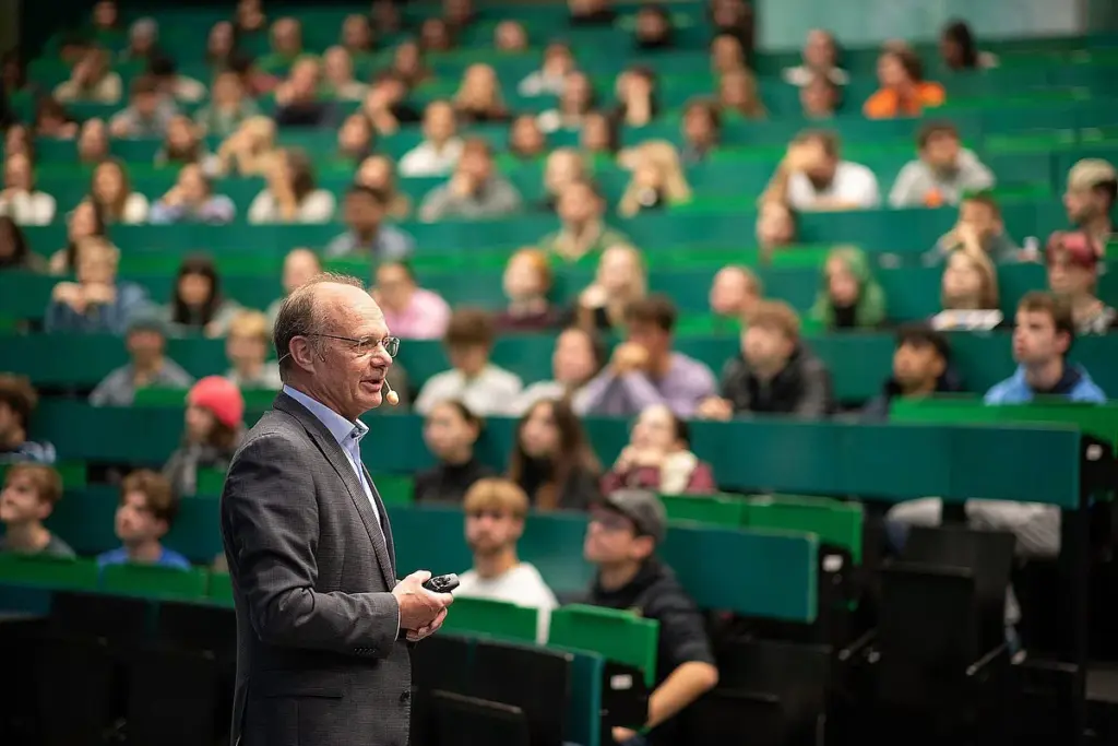 Offiziell wurden am Montagmorgen die neuen Studierenden der Uni Ulm im H4/5 von Universitätspräsident Professor Michael Weber sowie von Vertreterinnen und Vertretern der Verfassten Studierendenschaft (StuVe) begrüßt. Die Ansprachen wurden in weitere Hörsäle übertragen. „Jetzt beginnt für Sie ein neuer Lebensabschnitt, bei dem Sie sich mit Inhalten und Themen beschäftigen werden, die Sie begeistern. Bewahren Sie sich diese Neugier und Begeisterung“, riet Professor Michael Weber den Neulingen. „Gute Noten sind nicht alles. Wir helfen Euch auch, Eure Soft Skills weiterzuentwickeln, beispielsweise mit einem Engagement in der Studierendenvertretung oder einer der vielen Hochschulgruppen“, so die StuVe-Vorsitzende Julia Fokt und Igor Mikhailov vom Ressort Innen & Außen.