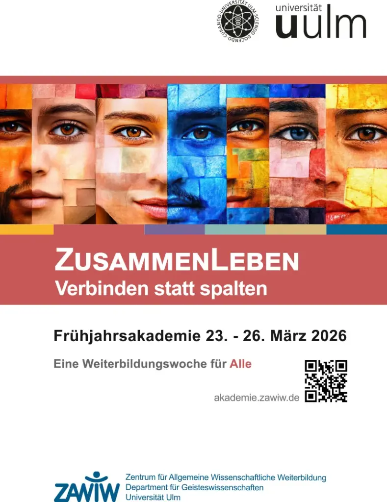 Gesellschaft ist eine gemeinsame Aufgabe. Die Frühjahrsakademie 2026 des Zentrums für Allgemeine Wissenschaftliche Weiterbildung (ZAWiW) der Uni Ulm bietet Impulse, Zusammenhalt neu zu denken und Wege zu erkunden, wie ein solidarisches Miteinander gestärkt werden kann. Insgesamt fünf Vorträge erlauben einen facettenreichen Dialog über Demokratie, Gerechtigkeit, Vielfalt und Verantwortung – und laden dazu ein, Gemeinsamkeiten und Verbindendes neu zu entdecken. Daneben gibt es Arbeitskreise, Raum für Begegnungen und die beliebten Mittwochsangebote.